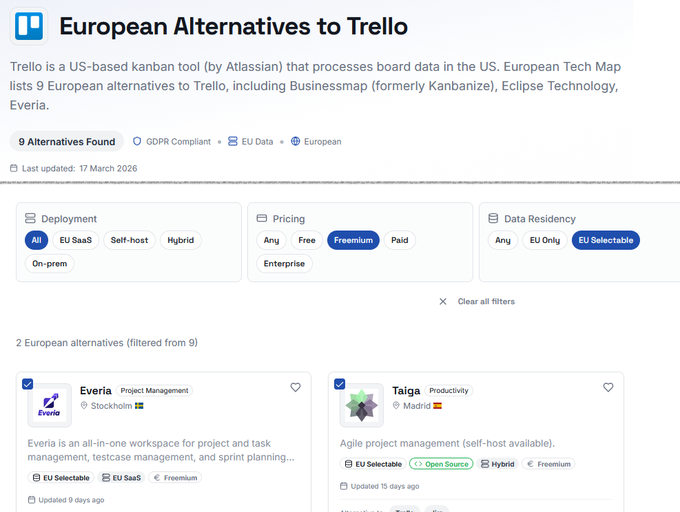 Using alternative providers to the big, chiefly US-based, means you can reduce dependency on non-EU tech providers and maintain control over your data. Many of the alternatives also offer self-hosting. The tool also includes information about open source and pricing.